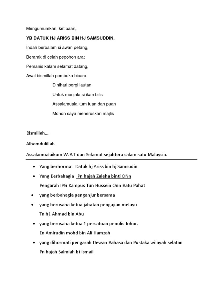 Kerjasama dan kesabaran anda amat. Perpustakaan Cawangan Sandakan menerbitkan Aneka Contoh Teks Pengacara Majlis. Selamat datang ke majlis makan malam disinilah memori tercipta anjuran persada uitm.